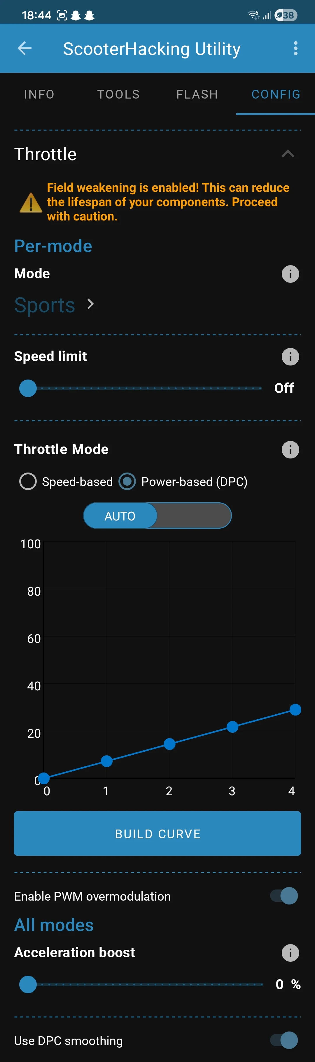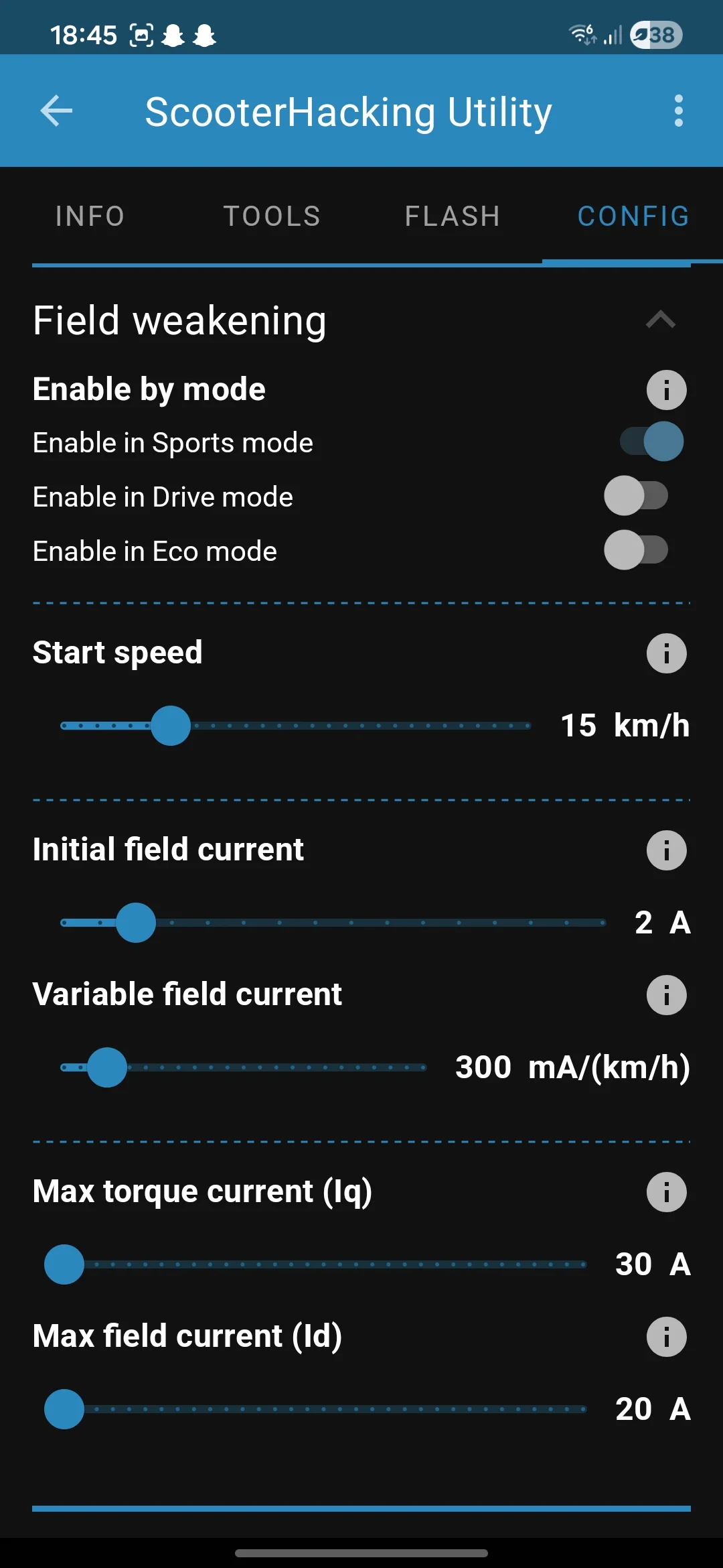 Moin, habe in Shu glaube 29A normal bei throttle eingestellt, aber teilweise hab ich unten Rum nur 4-500 Watt, geht erst hoch wenn field weakening anspringt. Wie muss ich die Einstellungen ändern damit er anfangs mehr Power hat? (Mir ist bewusst dass die Einstellungen Stand jetzt zurückhaltend sind) Einstellungen und Beschleunigung folgen. Vielen dank
