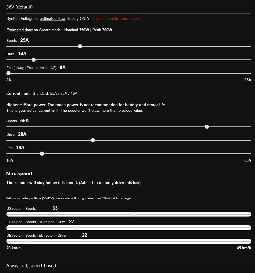 Ich hab mir jetz auch mal eine CFW gemacht. Die Ampere Werte sollten doch so alle im Grünen Sein oder? (Wiege ca 85kg). Mit GM würde sich ja auch nix ändern ausser dass der Tempomat verfügbar ist oder habe ich mich hier falsch eingelesen? Hab extra in allen Regionen 22km/h eingestellt weil mir das zum fahren ausreicht. Funktioniert das mit dem Rücklicht so wie es eingestellt ist das es beim Normalen Fahren nicht leuchtet und Beim Bremsen auch aus bleibt? Es soll nur Leuchten wen das Frontlicht auch eingeschaltet wird(Nachts).