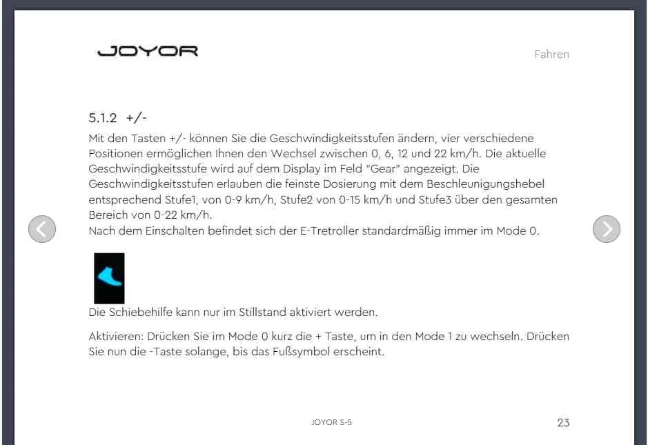 Der Scooter hat dafür kein Menü. Die Fahrstufen 1-3 werden nur als Zahl auf dem Display angzeigt und nach jeden ausschalten muss das neueingestellt werden.
