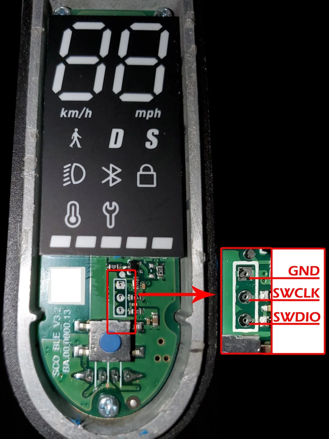 Um es aus diesem Zustand zu retten, solltet ihr die Verbindung zwischen Dashboard und ST-LINK löten, und die "write flash" Funktion in MiDu-Flasher ausführen. [Optional] Wenn die Lötpads/Kontakte beschädigt sind, hier ein Diagramm zum löten an der Rückseite: