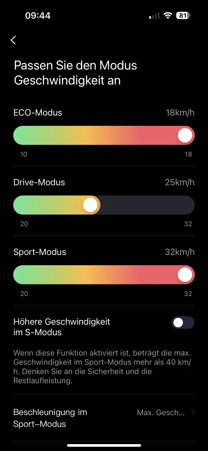 habe die Seriennummer auch geändert jedoch läuft mein p100 nur 32km/h. Die höhere Geschwindigkeit im S-Modus lässt sich auch nicht aktivieren. Bitte um Hilfe