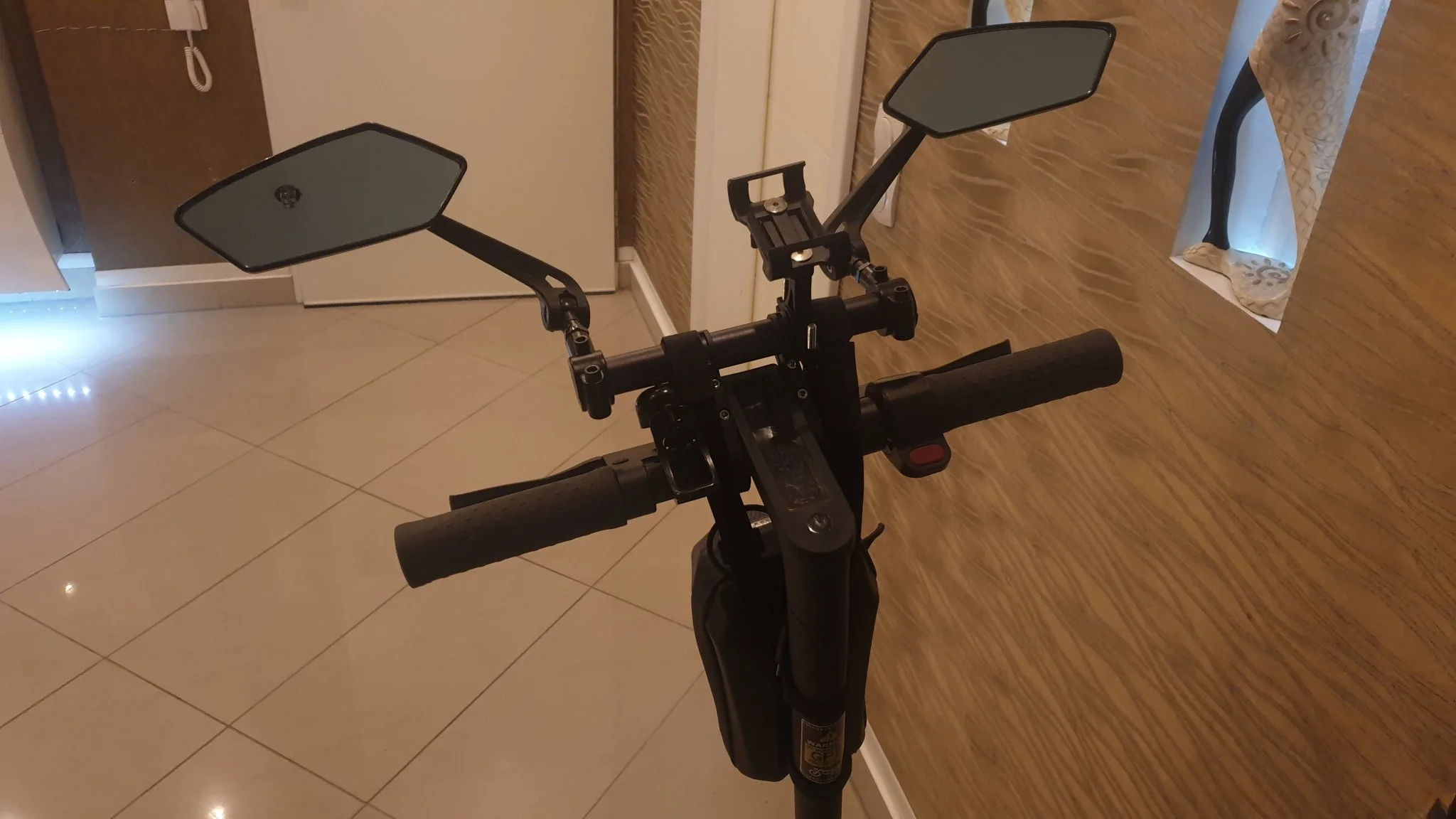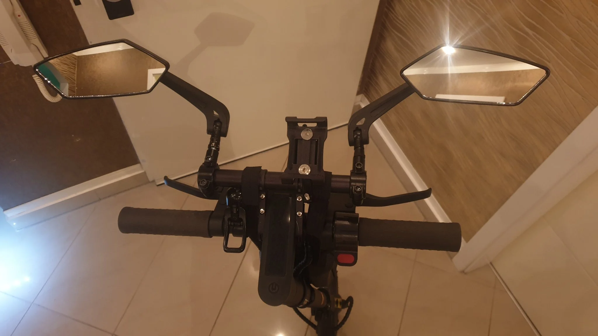 Die Spiegel würden nicht meine eigenen Anforderungen an Festigkeit erfüllen. Ein mal den Scooter zu ruppig hingelegt oder an die Wand gelehnt und die Verankerung in den Innenstreben vom Rohr würde brechen. Da muss ich noch mal ans Reißbrett. Immerhin vibrieren die nicht während der Fahrt, da habe ich anscheinend schon einige Chinaspiegel übertroffen
