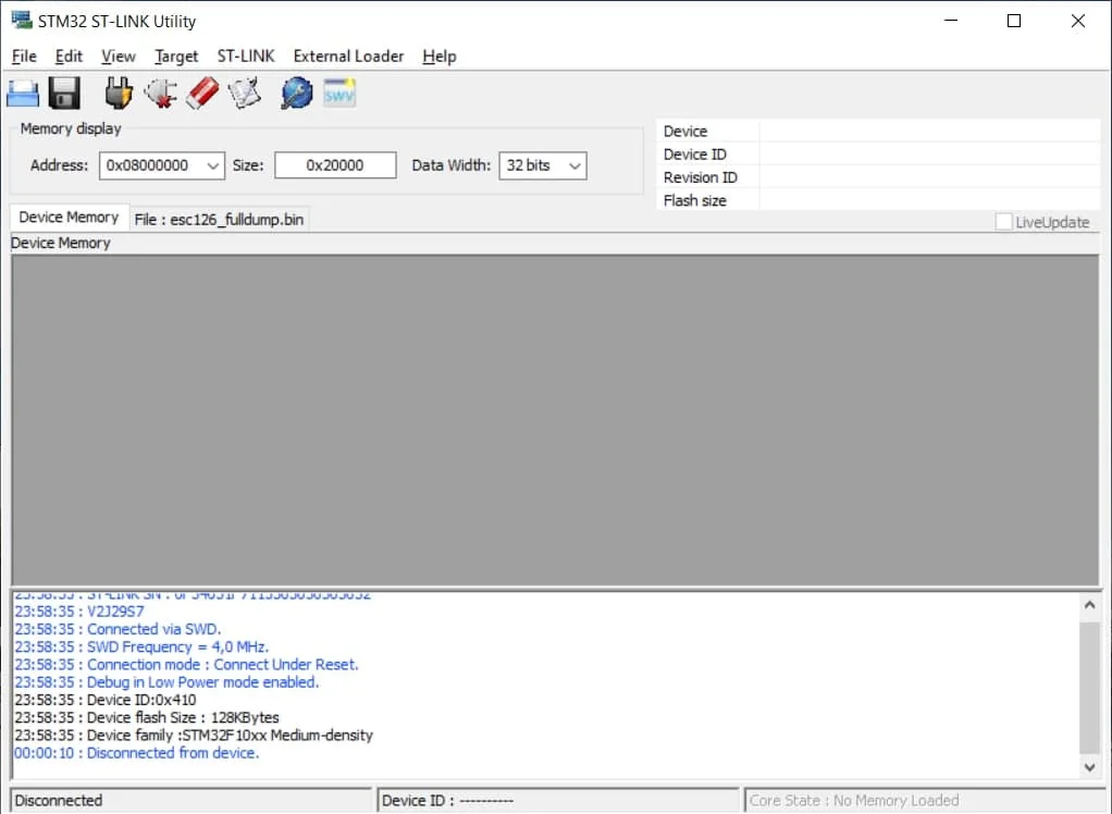 Wir erhalten so die Datei "esc126_fulldump.bin". Diese benötigen wir gleich in der STM32 ST-LINK Utility.