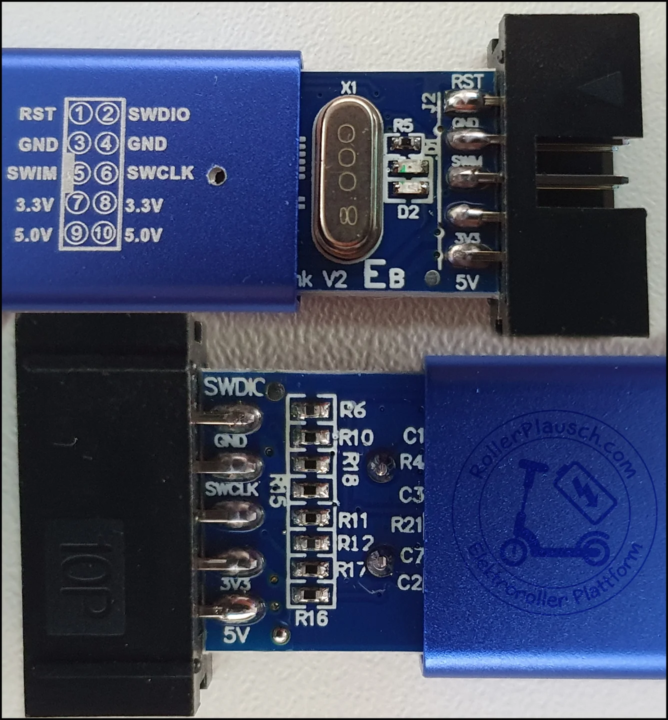 Hinweis: Es gibt diverse ST-Link Adapter auf dem Markt. Die Pin-Belegung kann sich von der hier dargestellten Variante unterscheiden!
