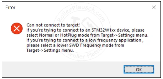 Solltet ihr die folgende Meldung bekommen, stimmt wahrscheinlich eure Pin-Belegung am Kabel nicht oder ihr habt keinen ausreichenden Kontakt zu den Kontakten auf der Leiterplatte. Zur Sicherheit einfach noch einmal nachmessen, bzw. die Nadelpositionierung nochmal kontrollieren!