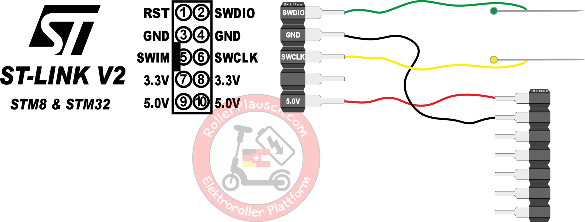 Das ist zunächst mal der Plan mit der Pin-Belegung. Links könnt ihr die Belegung eures ST-Link V2 erkennen.