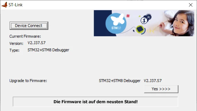 den Menüpunkt "Firmware update". In dem nun geöffneten ST-Link-Fenster betätigt ihr nun den Button "Device Connect".