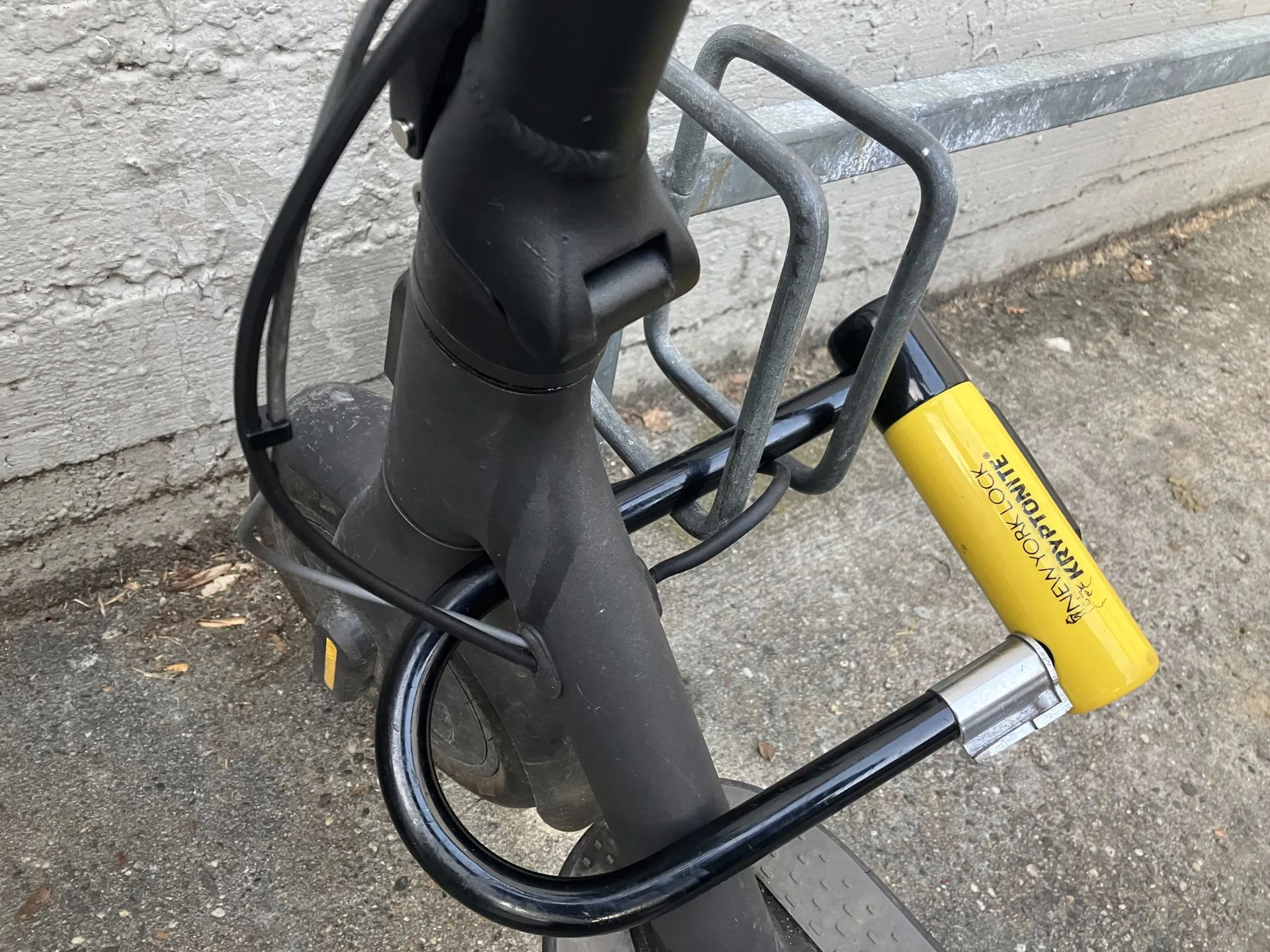 Ein Dieb würde hier wahrscheinlich den Fahrradständer durchflexen und den E-Scooter wegtragen, um dann zu Hause in Ruhe das Schloss loszuwerden (z.B. indem er den E-Scooter auseinandernimmt).
