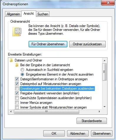 2. In dem Nächsten Fenster gehst du auf "Ansicht" und nimmst den Haken raus bei "Erweiterungen bei bekannten Dateitypen ausblenden"