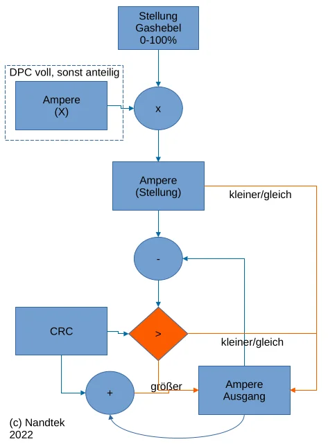 - Ist der Unterschied zwischem neuem und altem Amperewert kleiner als der CRC, dann wird der Amperewert direkt in den Ausgang geschrieben. Erhöht man den CRC, steigt diese Schwelle, dadurch sind bei Änderungen der Stellung des Gashebels größere Sprünge möglich. Der Gashebel wird dadurch nicht sensibler, sondern schwammiger!