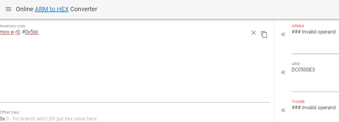 Jetzt wollte ich mit dem ARM to HEX Converter, den CRC Wert von 1000 auf 1500 erhöhen: