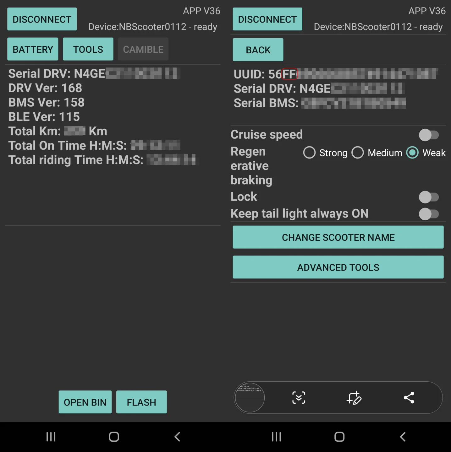 Bei m365 downG wählt man dazu zuerst CONNECT aus und verbindet sich mit seinem Scooter. Zum Pairen wirst du wahrscheinlich aufgefordert, den Power-Button am Scooter zu drücken. Wenn das erfolgreich war, siehst du nun die Seriennummer, die DRV-, die BMS- und die BLE-Version deines Scooters.