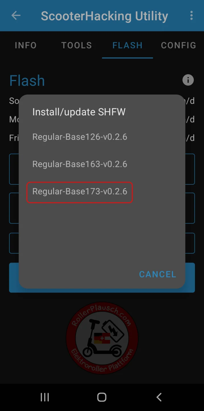 Die aktuelle SHFW Regular-Base173-v0.2.6 lässt sich nur dann installieren, wenn die aktuelle DRV-Version auf dem Controller kleiner als DRV1.8.3 (oder 1.7.13 je nach App dargestellt) ist. Ansonsten muß man den ESC zuerst per ST-Link downgraden.
