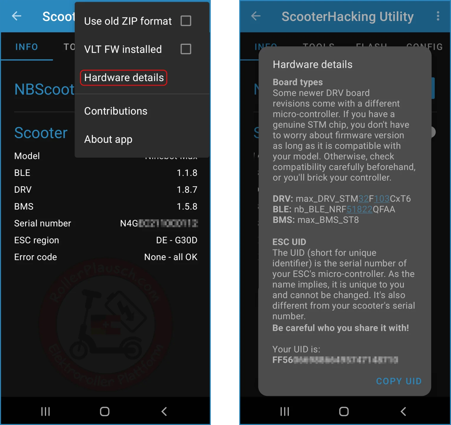 Um 100%ige Sicherheit zu bekommen, schraubt einfach die Bodenplatte eures neuen G30 (Baujahr 2022) auf undIn der ScooterHacking Utility (SHU) verbindest du dich dazu mit deinem Scooter. Im INFO-Screen siehst du jetzt die Modellbezeichnung, die BLE-, die DRV- und die BMS-Version deines Scooters, sowie die Seriennummer, die Region und eventuell vorhandene Errorcodes. Nun drückst du mal oben rechts auf die drei Punkte und wählst dort Hardware details aus. Am Ende des nun angezeigten Textes, findest du nun die UID des Microchips auf deinem Controller.
